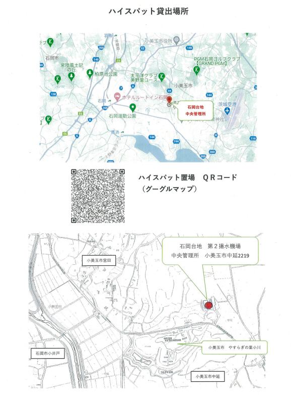 ※貸出し場所 〒311-3422 小美玉市中延2219 石岡台地土地改良区 中央管理所 TEL 0299-58-1468