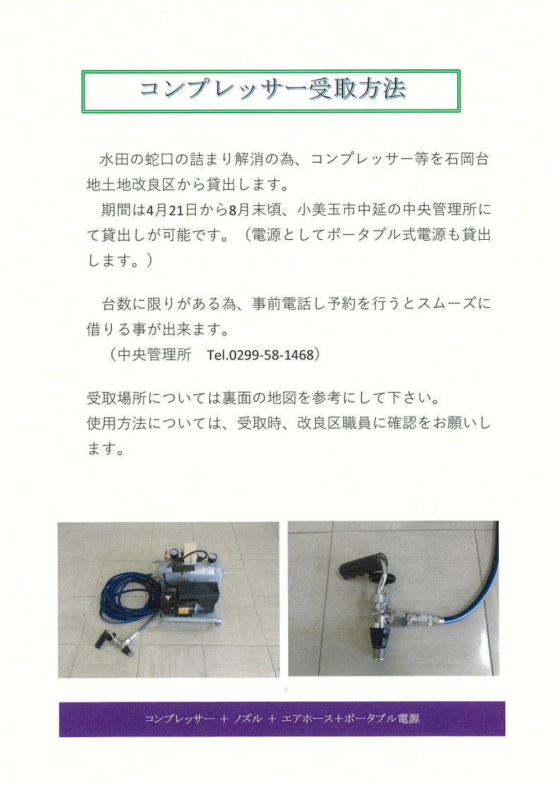 石岡台地土地改良区では、詰まり解消の為、コンプレッサーの貸出しを行っております。